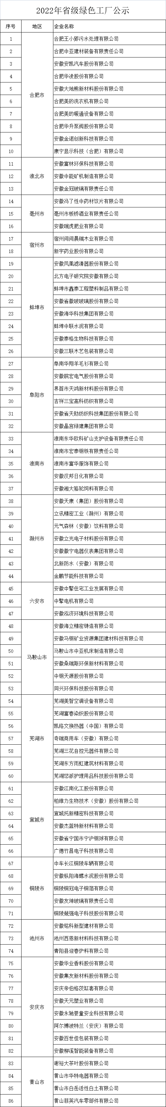 经企业申报、各市经济和信息化主管部门审核推荐、安徽省经信厅初审、专家评审等程序,拟评价安徽省86家企业为2022年省绿色工厂。