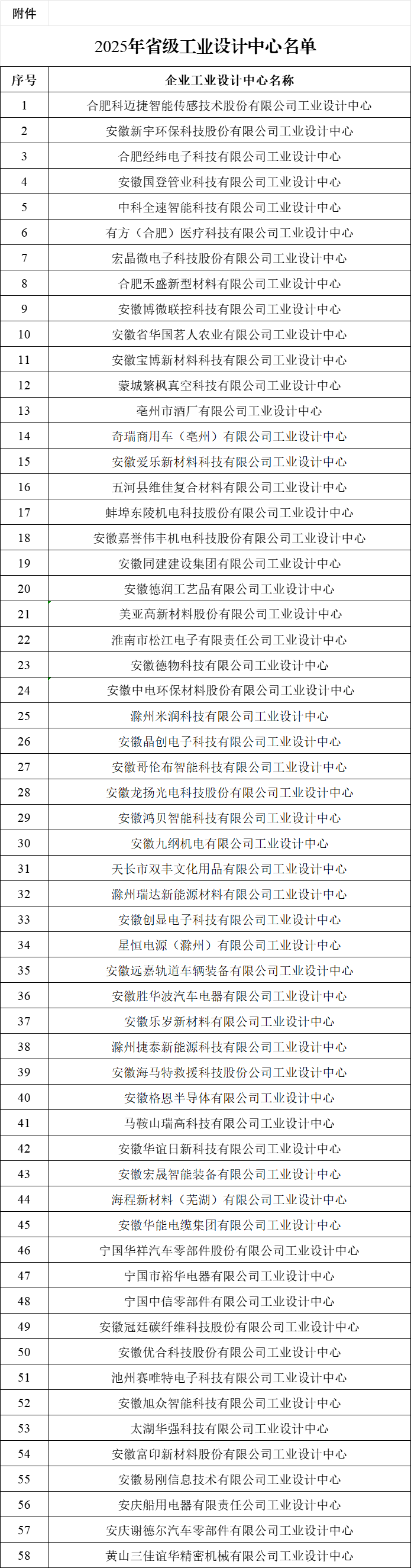 安徽省工业和信息化厅关于公布2025年省级工业设计中心名单的通知